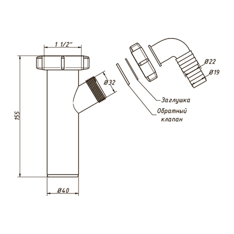 Предназначен для подключения слива от бытовой техники (стиральная/посудомоечная машины) к сифону. Имеет два диаметра подключения — 19 и 22 мм. В комплекте есть заглушка. Присоединительные диаметры — 1 1/2″ к выпуску и 40 мм к бутылке.