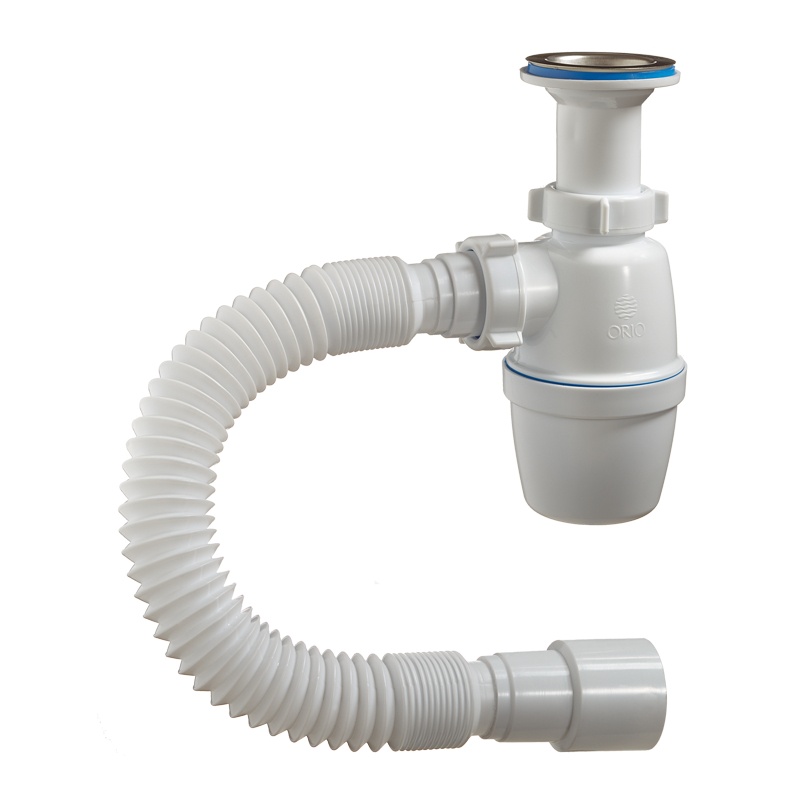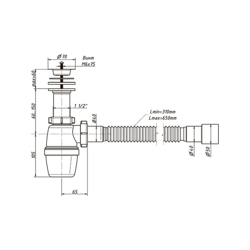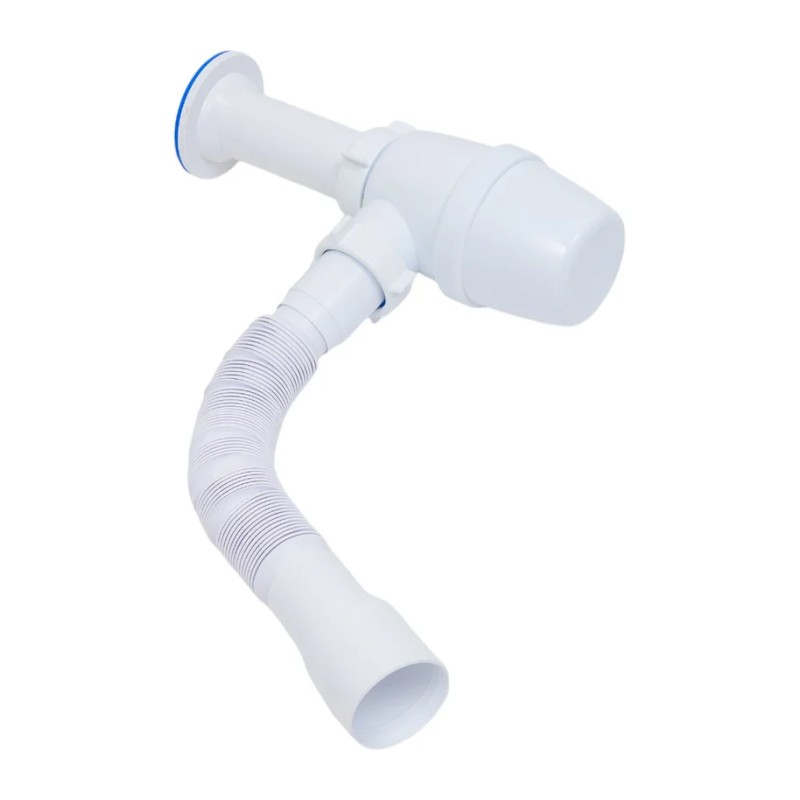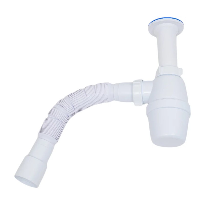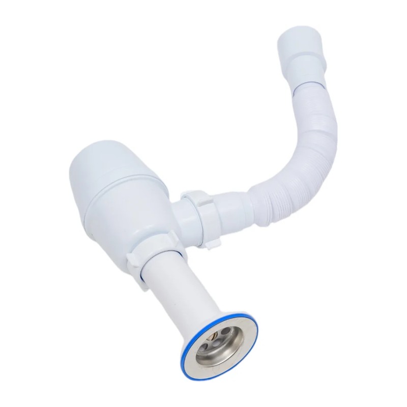 Предназначен для использования в раковинах, мойках. Высота гидрозатвора 60 мм, что соответствует гигиеническим нормам. Сливное отверстие из корпуса сифона имеет отверстие диаметром 40 мм и снабжено механизмом цангового зажима с использованием конической прокладки. Сифон комплектуется гофрированной трубкой длиной 650 мм, с универсальным выпуском 40/50 мм. Решетка из нержавеющей стали диаметром 70 мм.