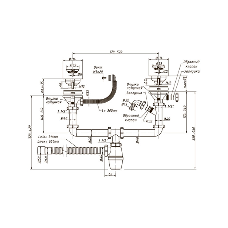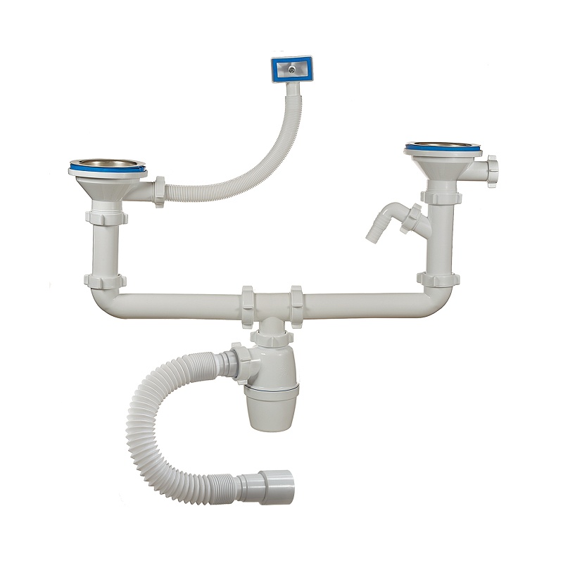 Предназначен для отведения в канализационную сеть сточных вод из санитарно-технических приборов — двойных одно/разноуровневых нержавеющих кухонных моек с диаметром слива 90 мм и с прямоугольным переливом и создания водяного затвора, для предотвращения попадания канализационных запахов в помещение. В комплекте есть отвод для подключения слива от бытовой техники, который имеет два диаметра подключения -19 и 22 мм; заглушка, на случай если отвод пока не нужен; две прокладки — прямоугольная для квадратной формы мойки и полукруглая для круглой мойки и гибкий отвод в канализацию, который позволяет подключиться к канализации с диаметрам 40 или 50 мм.