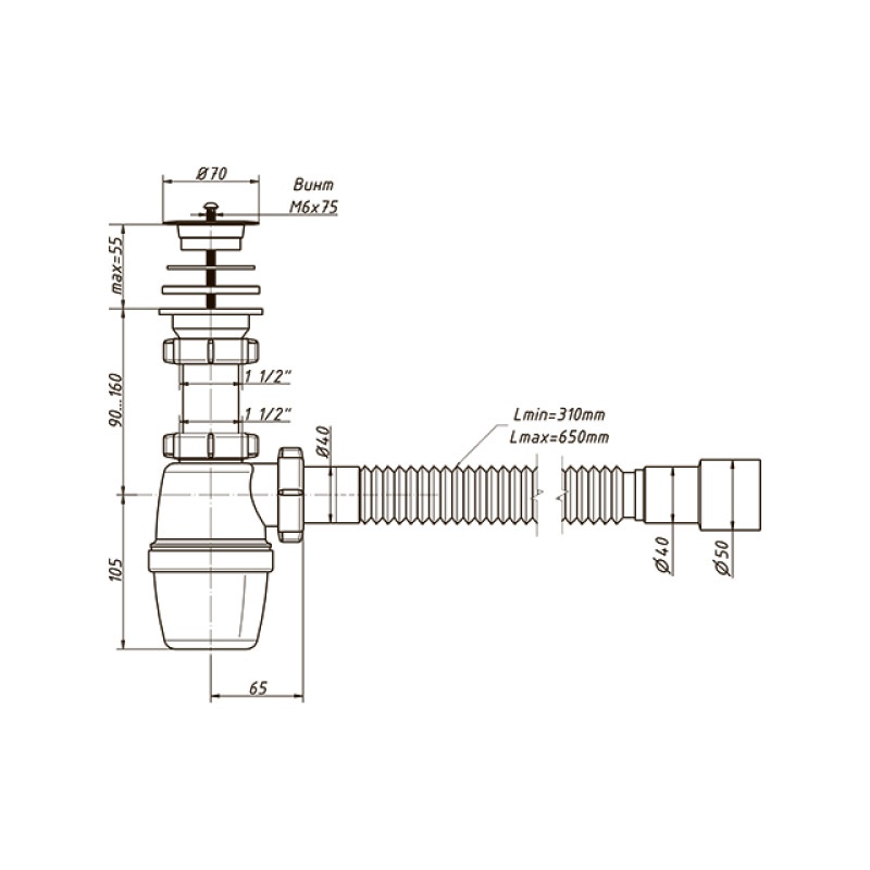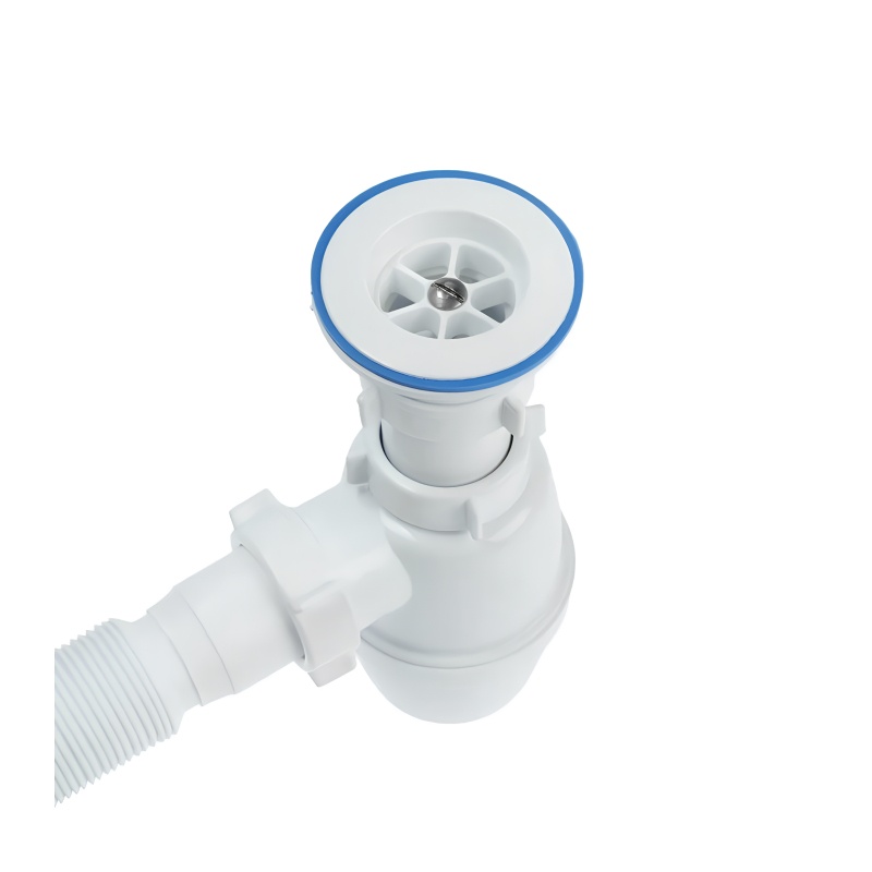Предназначен для использования в раковинах, мойках. Высота гидрозатвора 60 мм, что соответствует гигиеническим нормам. Сливное отверстие из корпуса сифона имеет отверстие диаметром 40 мм и снабжено механизмом цангового зажима с использованием конической прокладки. Сифон комплектуется гофрированной трубкой длиной 650 мм, с универсальным выпуском 40/50 мм. С пластиковой решеткой диаметром 70 мм.