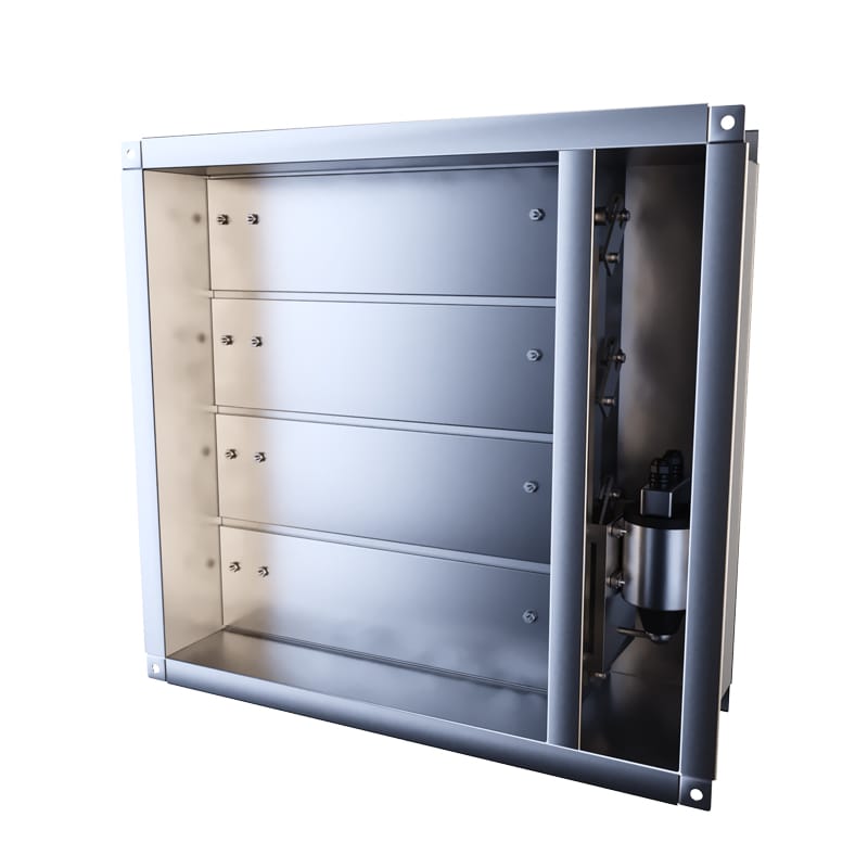 Клапан стенового исполнения имеет конструкцию, предназначенную для монтажа в стенной проем. Данные клапаны могут монтироваться в перегородке лифтовых шахт. Клапан представляет собой прямоугольный корпус, изготовленный из 1 мм стали с внутренним размещением привода