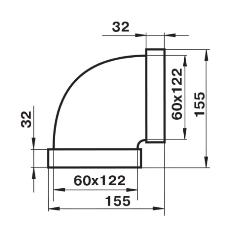 Предназначен для соединения плоских вентиляционных каналов размером 120х60 мм в горизонтальной плоскости под углом 90 градусов.