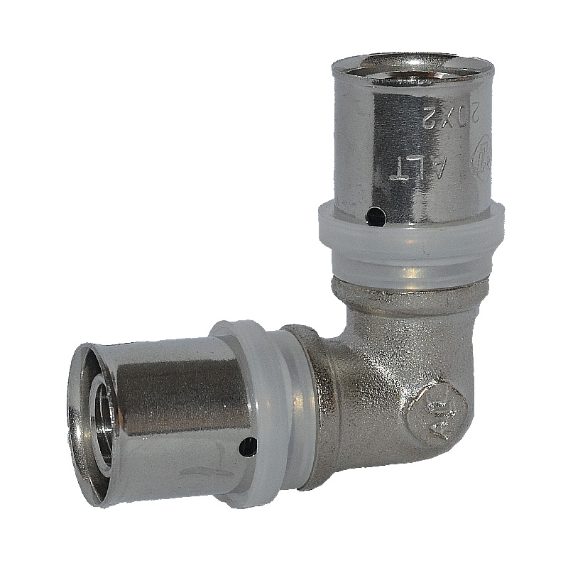 Предназначен для соединения металлопластиковых труб диаметром 16 мм, под углом 90 градусов. Устанавливается (опрессовывается) с помощью специального инструмента — пресс-клещей.