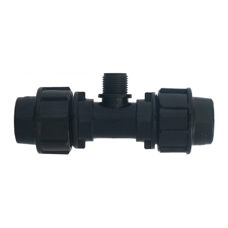 Тройник выполнен из полипропилена и предназначен для разветвления потока воды на два направления. Имеет два выхода для соединения полиэтиленовых труб диаметром d=25 мм и один выход с наружной резьбой 1/2″. Используется в системах хозяйственно-питьевого водоснабжения для транспортирования воды с температурой до 40° С и максимальным рабочим давлением 1,6 МПа.