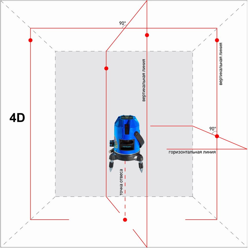 Инструмент обладает способностью выстраивать вертикальные линии в количестве 4 штук и 1 горизонтальную, а также предусматривает точку отвеса. Его используют во внутренних и наружных работах.
