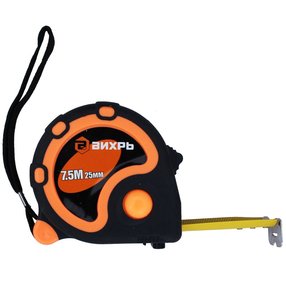 Рулетка измерительная ВИХРЬ 7,5мх25мм изготовлена из ударопрочного пластика с прорезиненным покрытием, защищающим ее от повреждений. Измерительная лента из высококачественной стали с нейлоновым покрытием обеспечит долговечность и стойкость к истиранию шкалы. Есть фиксатор механизма сматывания полотна. Также предусмотрен ремешок для переноски на руке. Длина ленты 7,5 метров, ширина 25 мм.