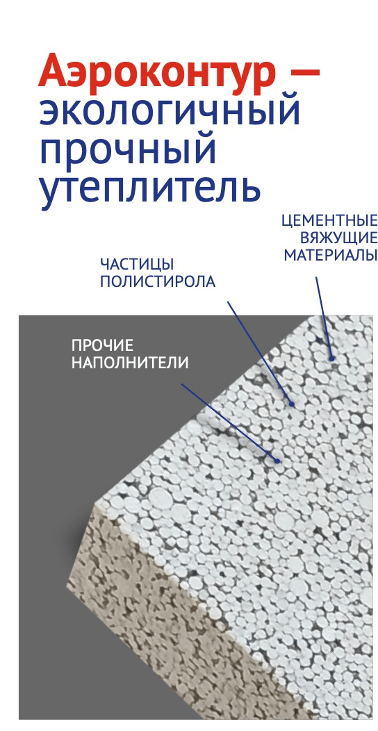 Аэроконтур — это негорючая теплоизоляционная плита, которая формуется путем добавления наполнителей в сочетании с небольшим количеством частиц полистирола, цемента и полимерных волокон.