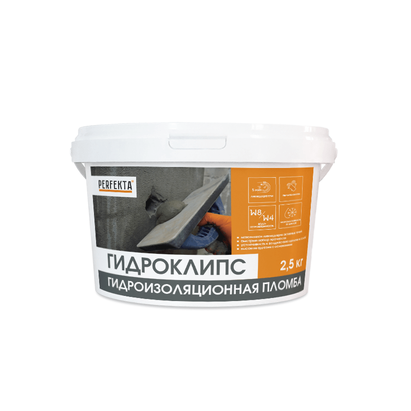 Гидроизоляционная пломба «Гидроклипс» содержит цемент и при контакте с потом или другой телесной влагой может вызвать раздражающую щелочную реакцию. Во время приготовления и проведения работ, следует использовать защитные перчатки и очки, а также принимать обычные меры предосторожности при обращении с химическими продуктами. При попадании в глаза или на кожу, тщательно промыть большим количеством воды, и при необходимости, обратиться к врачу. Беречь от детей.
