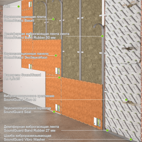Готовый набор ВСЕХ необходимых материалов для бескаркасной звукоизоляции стены.