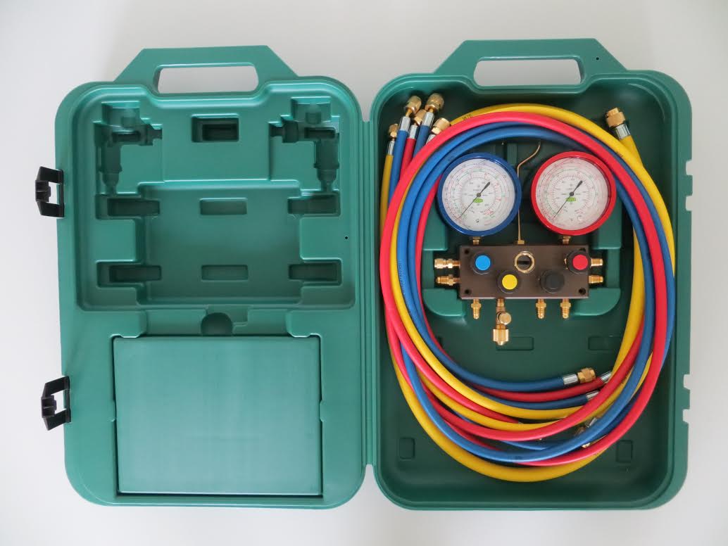 Набор коллектора с 5 заправочными шлангами 150см под хладагенты R22, R410A, R407C и 1 вакуумным шлангом 150см в пластиковом кейсе.