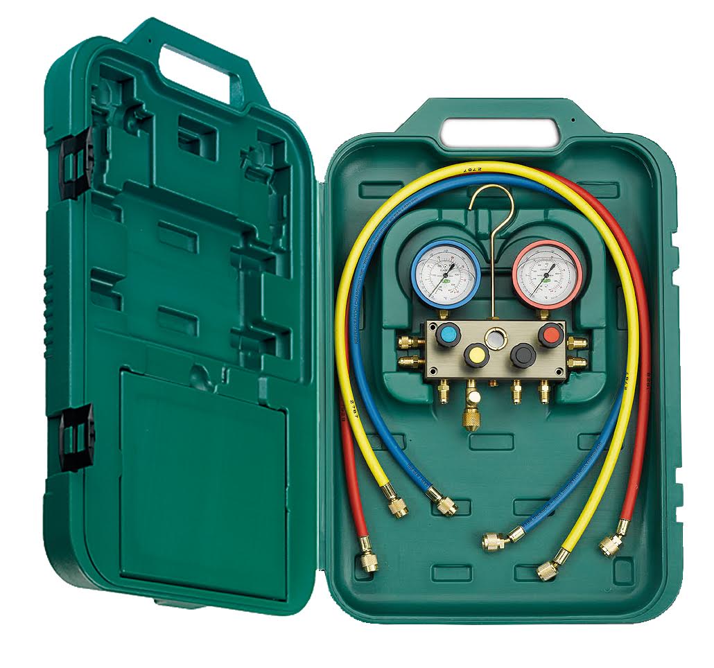Набор коллектора с 3 заправочными шлангами 150см под хладагенты R32, R410A и 1 вакуумным шлангом 150см в пластиковом кейсе.