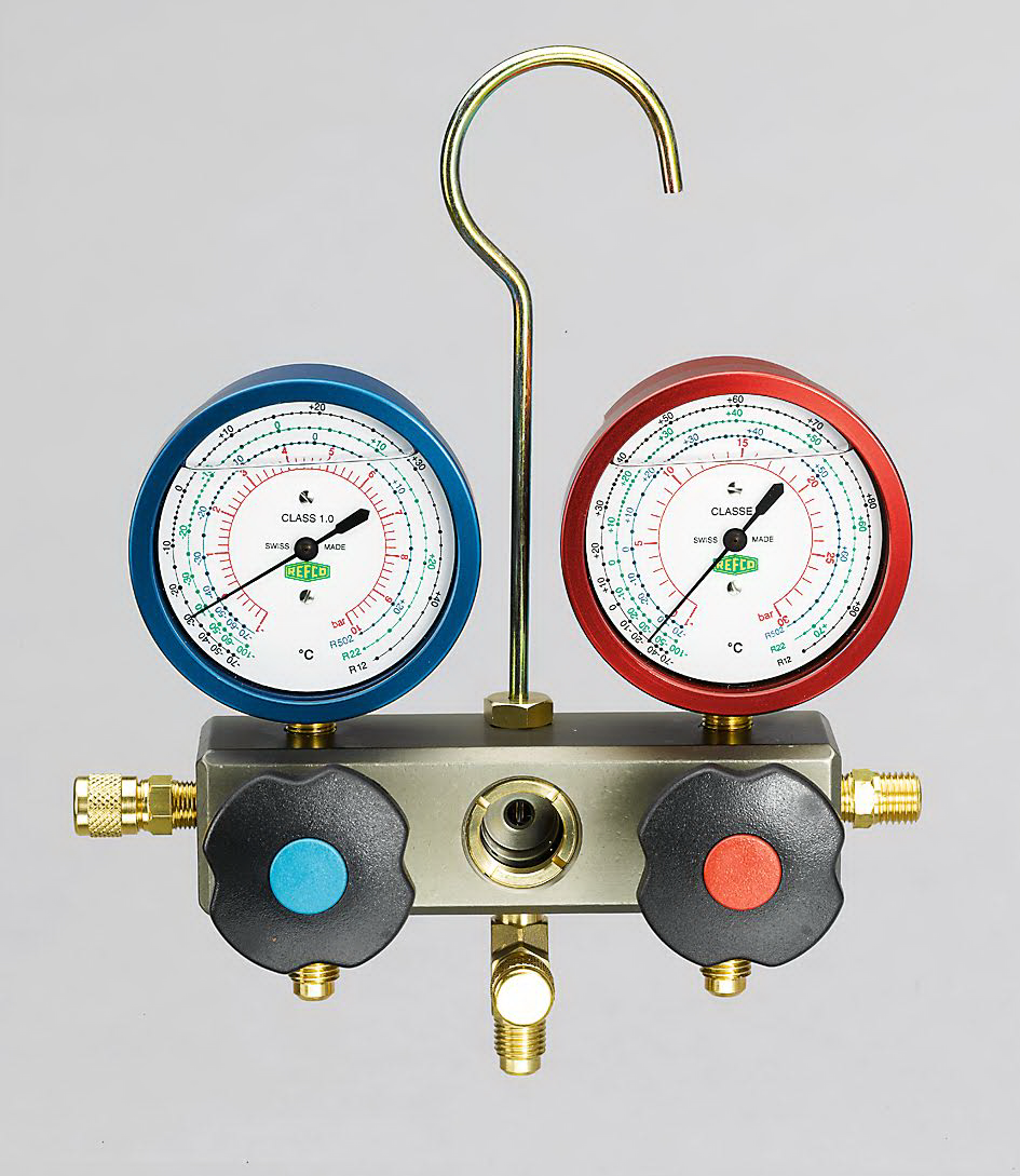 Наборы коллекторов с манометрами типа Bellow, с шлангами 90см под хладагенты R22а. Шланги имеют шаровые вентили.