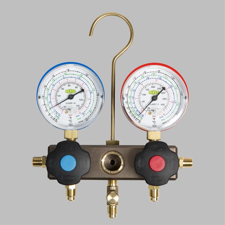 Двухвентильный манометрический коллектор для газов R290, R600, R600a, с пружинными манометрами, крюком, без аксессуаров, в блистерной упаковке.