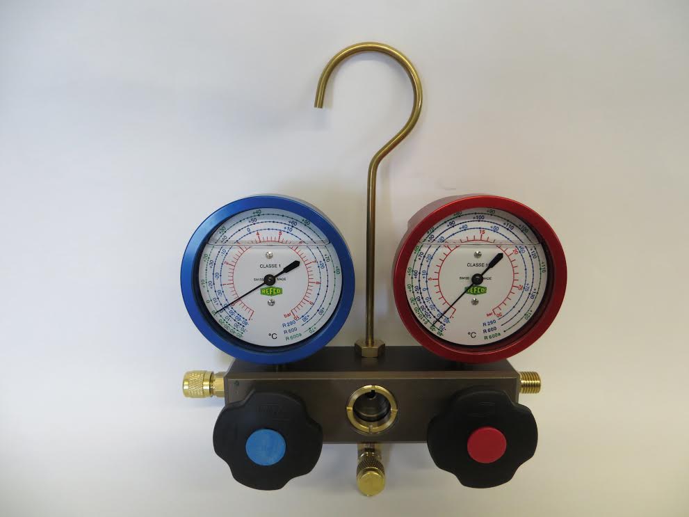 Двухвентильный коллектор с манометрами с маслом, с крюком, в пластиковом кейсе с 3 шлангами по 90см. Для хладагентов R290-R600-R600a.