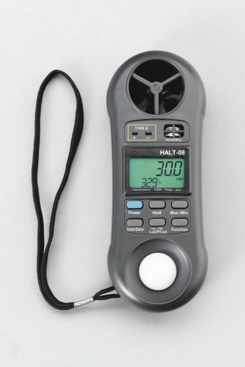 Мультиметр малого размера для измерения влажности, скорости воздушного потока, интенсивности света и температуры. Для измерения температуры прилагается зонд.