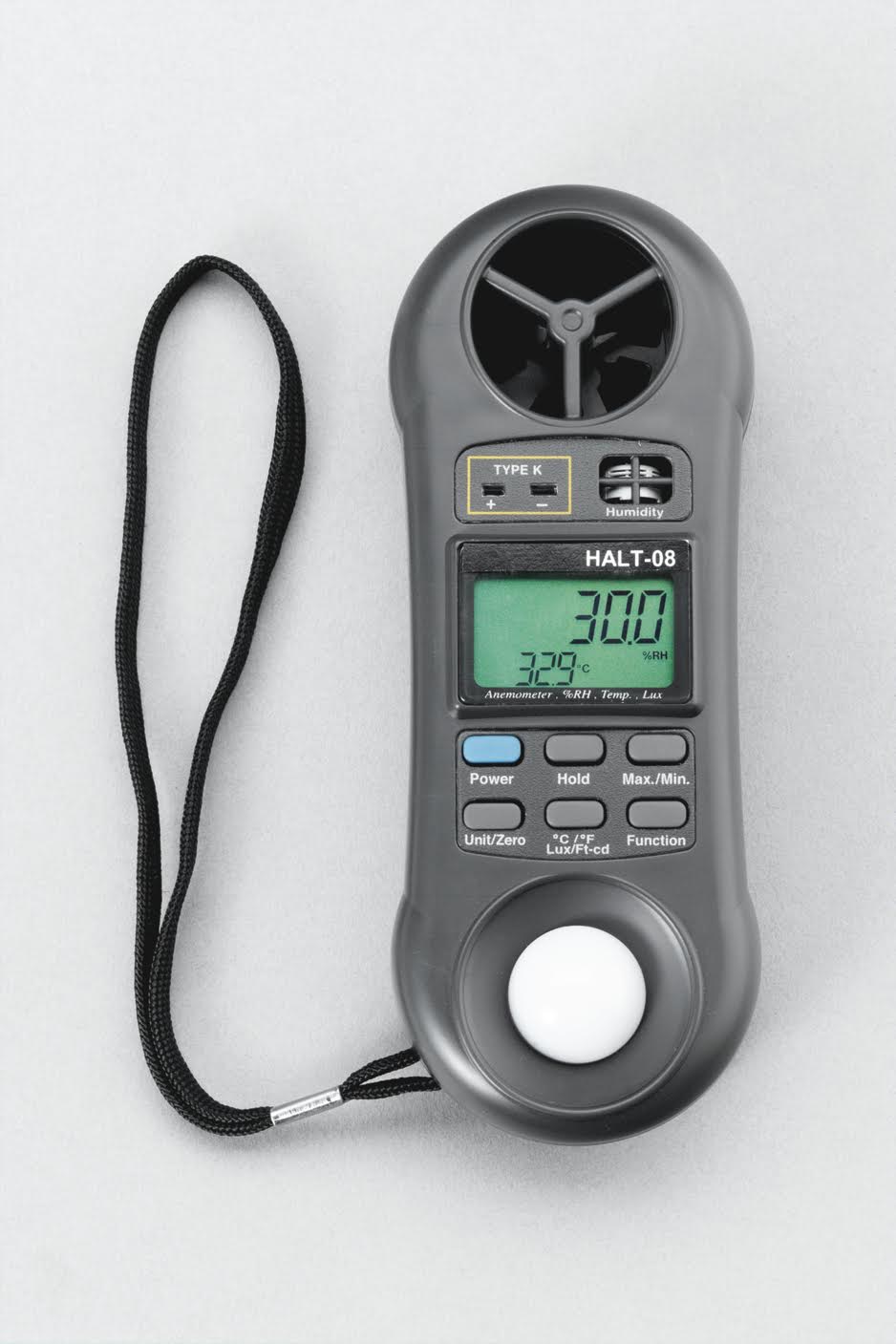 Небольшой, портативный многофункциональный прибор для измерения влажности, скорости потока воздуха, интенсивности освещения и температуры.