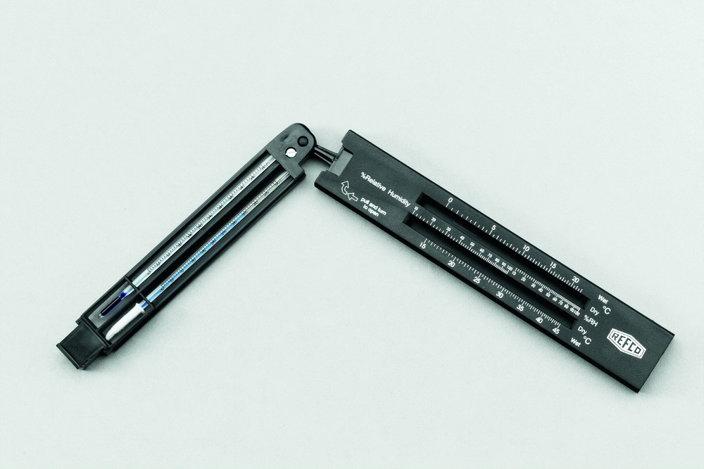Складной прибор для простого измерения влажности. Без ртути. Диапазон температур: от 0°C до +45°C, влажности: от 0 до 100%.