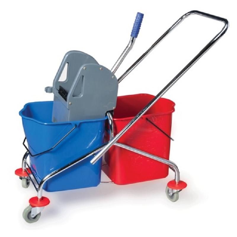 Уборочная тележка предназначена для проведения влажной уборки в помещениях. Представляет собой металлический каркас с установленными на него двумя ведрами и механическим отжимом. Оснащена перекидной ручкой.