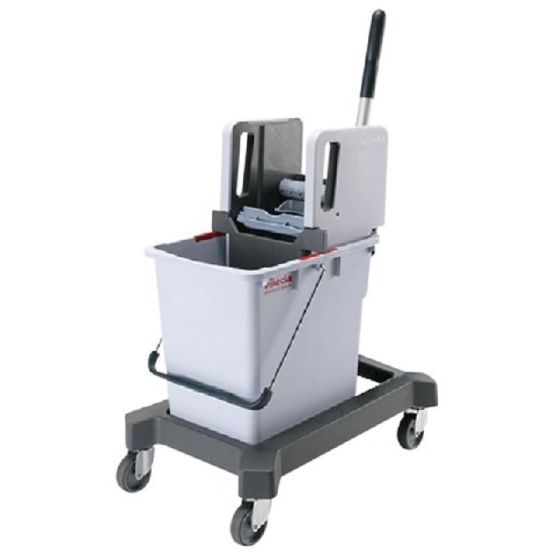 Одноведерная система с вертикальным отжимом на прочной устойчивой базе удобна для работы на небольших площадях. Ведро можно снимать с базы для транспортировки. Универсальный вертикальный отжим позволяет отжимать насадки «Кентукки» и плоские МОПы.