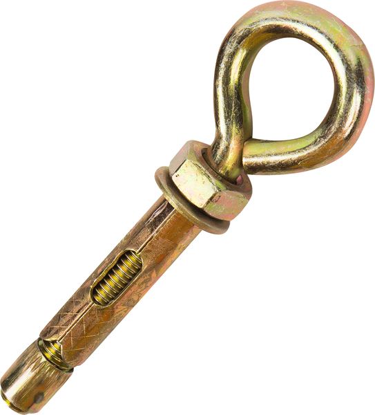 Анкерный болт с кольцом применяется для крепления различных конструкций к бетонному или кирпичному основанию, для крепления подвесных потолков, люстр, натяжения тросов, канатов и другого монтажа. Он состоит из распорной металлической втулки, винта-кольца с метрической резьбой и конусной гайки на конце.