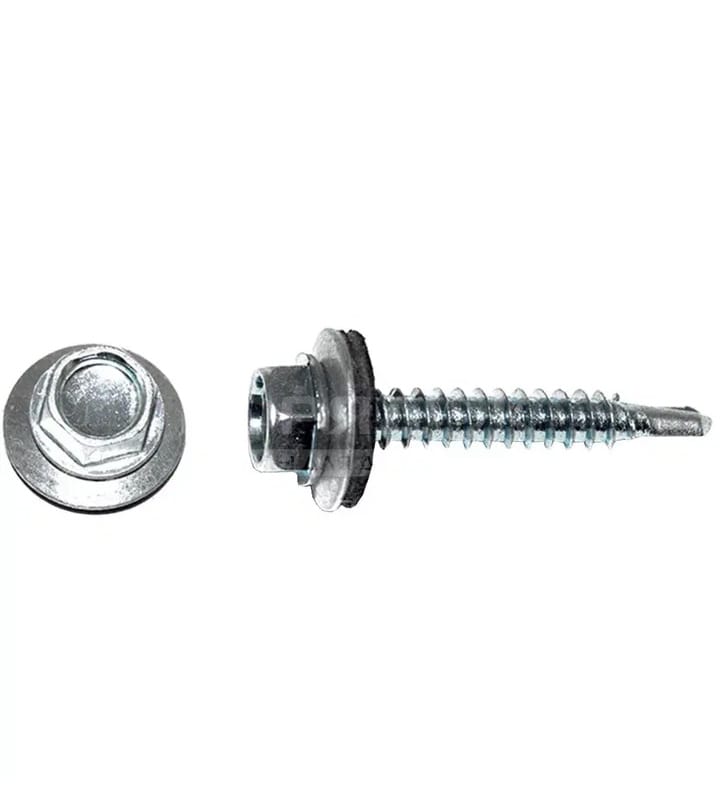 Кровельные саморезы диаметра 4.8 мм разработаны для крепления кровли к дереву, они имеют характерный редкий шаг резьбы и уменьшенное сверло. Головка у саморезов под шестигранную биту, также имеется шайба плоская с резиновой прокладкой EPDM для повышения герметизации.