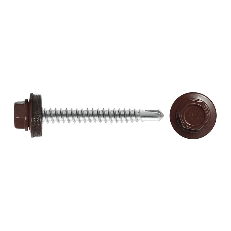 Предназначен для крепления кровельных материалов к металлическим и деревянным каркасам. Имеет окрашенную шестигранную головку с шайбой и резиновой прокладкой EPDM, наконечник — сверло.