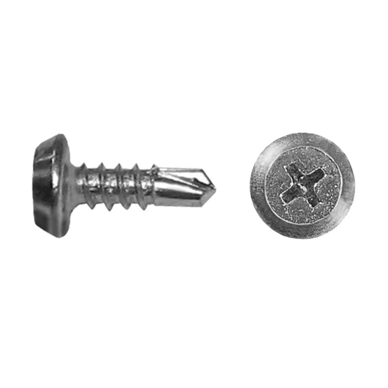 Саморез используется для крепления листов металла толщиной до 2 мм без предварительного сверления. Имеет полуцилиндрическую (усеченный конус) головку, крестообразный шлиц Phillips №2, наконечник — сверло, частую резьбу.
