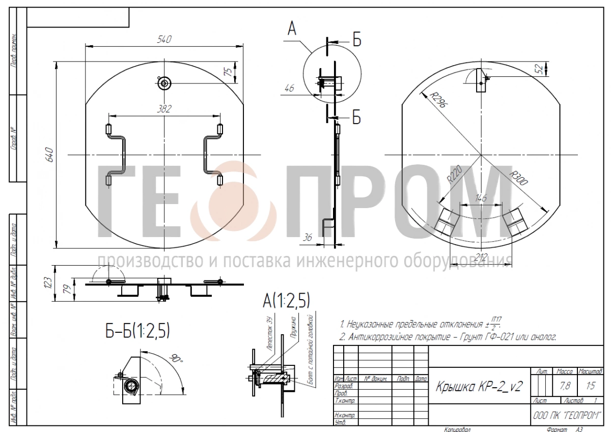 Такая крышка подходит на любой чугунный колодец. Устанавливается на опорное кольцо. Толщина стального листа, используемого при изготовлении изделия, составляет 5 мм. Благодаря этому, создаётся надёжная защита для канализационного колодца.