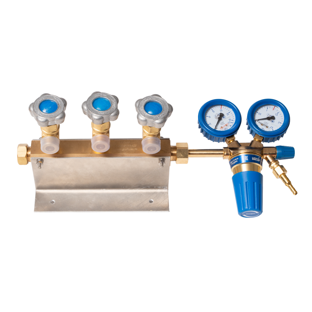Коллектор КР-01 кислородный 3-х вентильный предназначен для использования в кислородной рампе на 3, 5 или 6 баллонов.