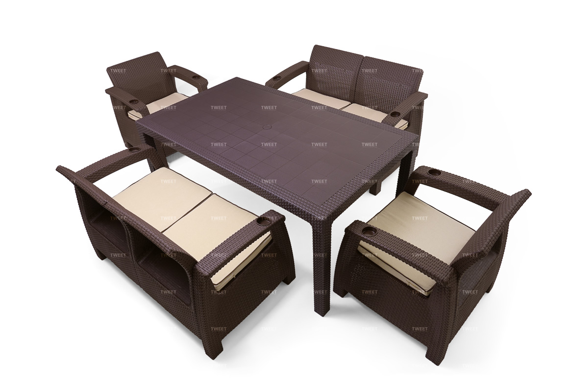 Самый большой комплект из всей линейки мебели от TWEET. Наилучшее соотношение цена/качество/количество — комплект садовой мебели TWEET Family Set  из 2-х кресел, 2-х диванов и обеденного стола. Набор цвета Венге с бежевыми подушками позволит с комфортом разместить 6 человек одновременно.