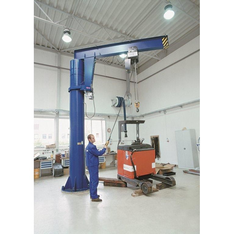 Кран консольный поворотный на колонне стационарный ККМ предназначен для подъема, опускания и горизонтального перемещения груза. Консоль крана (тип 7) вращается вокруг оси колонны, закрепленной на фундаментной плите анкерными болтами. Вращение крана осуществляется посредством мотор-редуктора, через опорные катки. Подъем, опускание и перемещение груза по консоли крана осуществляется посредством электрической тали. Область применения крана ККМ — складские, производственные помещения и открытые площадки общего назначения.