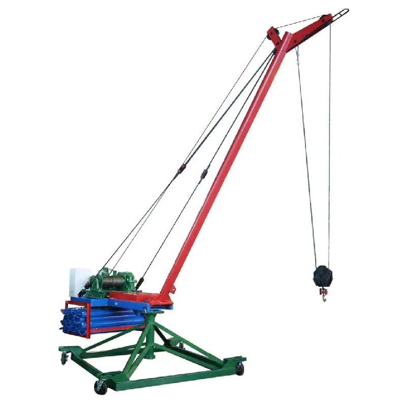 Кран состоит из опорной рамы (2м*2м), на которой установлена поворотная платформа, соединенная шарниром со стрелой, крюковой подвески с полиспастом, оттяжек стрелы, электрического оборудования, лебедки и противовеса, закрепленного на задней части поворотной рамы для лучшей устойчивости крана.