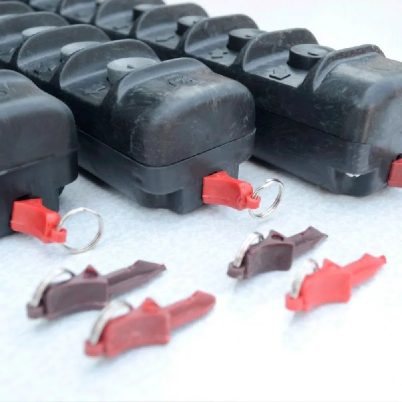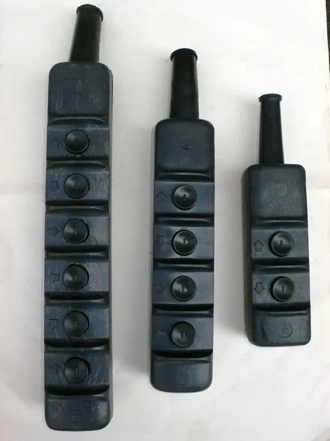 Тельферный или кнопочный пост ПКТ имеет вид панели из пластмассы со встроенным толкателем кнопок (цилиндрической формы) и крышкой, которая закрывает доступ к электрическим контактам. Кнопочки оснащены двумя изолированными контактами: 1 разомкнутый + 1 замкнутый. Вышедший из строя элемент заменить нельзя, так как панель и кнопки монолитны. Чтобы исключить случайное включение управляемого объекта, производители предусмотрели ключ, который блокирует работу кнопок. С помощью резинового манжета пост можно подвесить на кабеле.