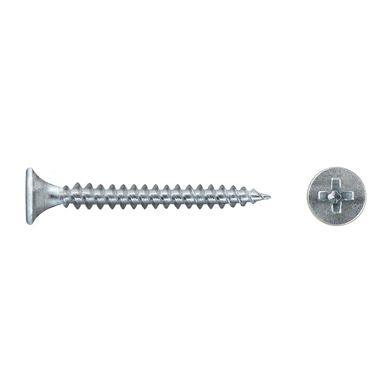 Предназначен для крепления листов гипсокартона к металлическому профилю без предварительного сверления. Имеет потайную рожковую головку, крестообразный шлиц Phillips №2, острый наконечник, частую двухзаходную резьбу.