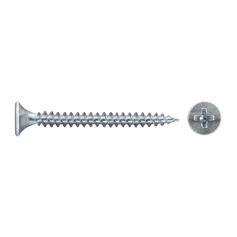 Предназначен для крепления листов гипсокартона к металлическому профилю без предварительного сверления. Имеет потайную рожковую головку, крестообразный шлиц Phillips №2, острый наконечник, частую двухзаходную резьбу.