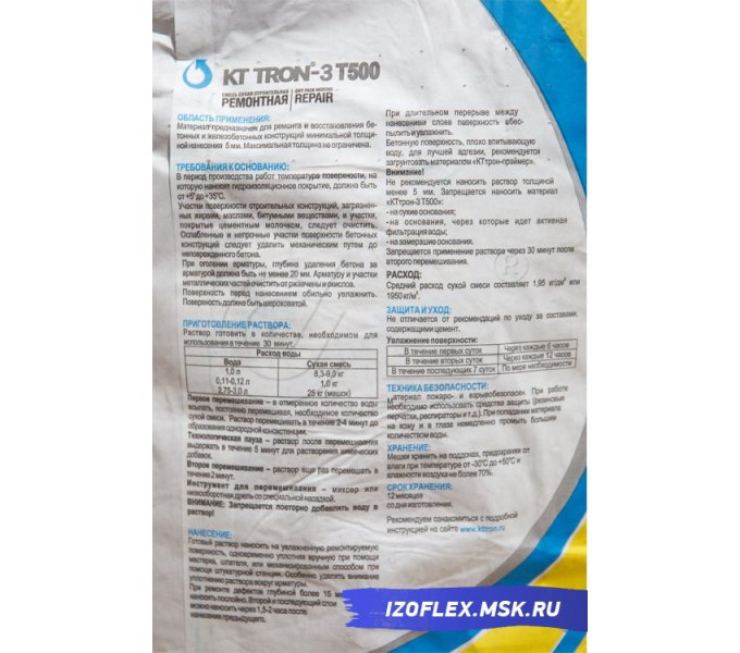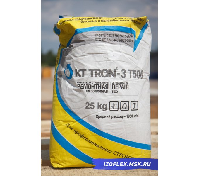 КТ трон–3 Т500 — это смесь на цементной основе, используемая при ремонте особо прочных конструкций из бетона. В составе также присутствуют модификаторы, укрепляющие волокна и минеральные заполнители. Представляет собой порошкообразный продукт, при разведении которого образуется сверхпрочный раствор, обладающий тиксотропностью, характеризующийся отсутствием усадки и улучшенной адгезией после отвердения. После застывания получается поверхность серого оттенка, схожего с цветом цемента.