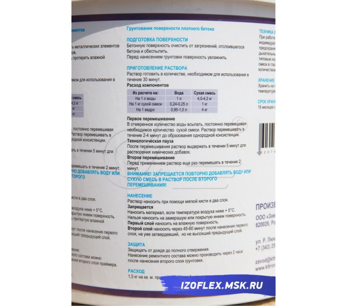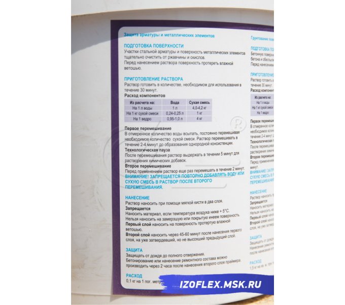 Расход воды для затворения 1 кг сухой смеси: — защита арматуры — грунтование плотных бетонов — грунтование пористых поверхностей | 0,24-0,25 л 0,24-0,25 л 0,5-0,6 л |