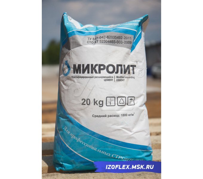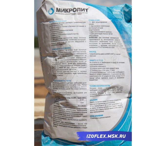 Микролит представляет собой пластифицированную расширяющуюся цементную смесь дополненную минеральными наполнителями мелкой фракции и модификаторами. После смешивания с водой получается высокотекучий раствор, характеризующийся высокими адгезионными свойствами, способный к самоуплотнению и не дающий усадки после отвердения.