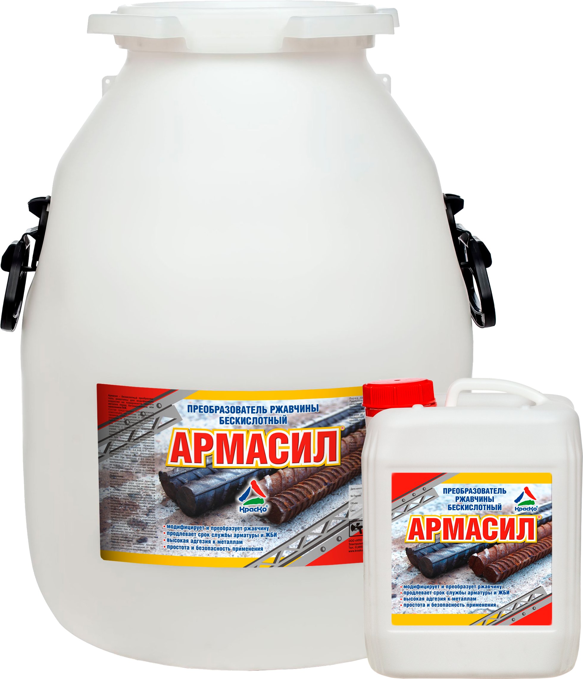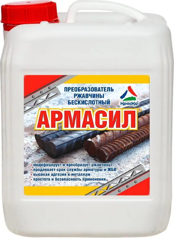Преобразователь «Армасил» предназначается для обработки арматуры классов А I — А IV. Он способствует переводу оксида железа в неактивные соединения, обладающие высоким уровнем адгезии.