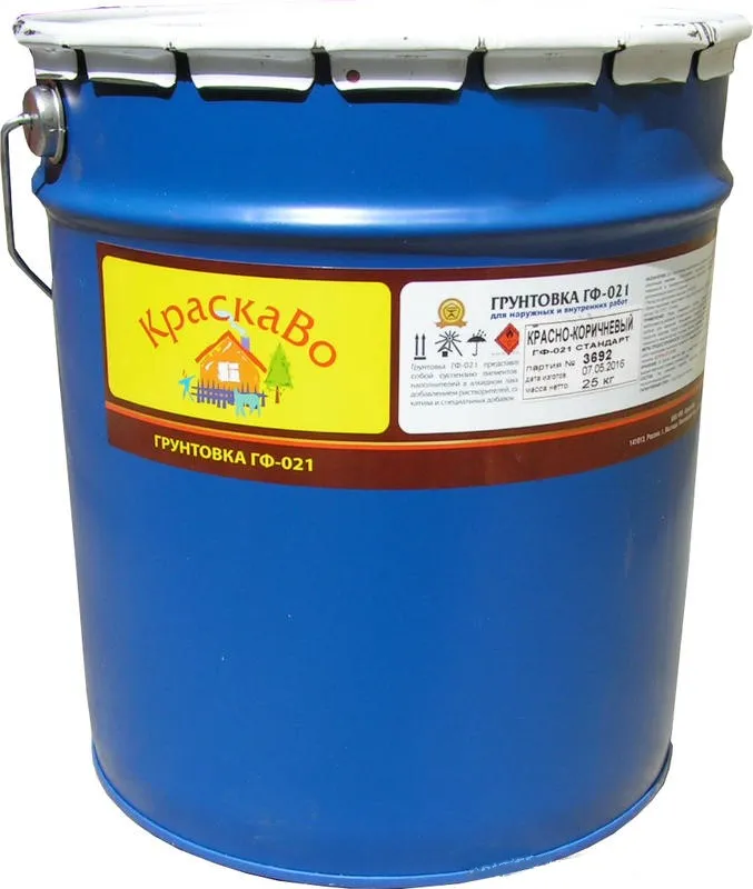 Грунтовка ГФ-021 красно-коричневая используется при грунтовании металлических и деревянных поверхностей, которые в дальнейшем будут покрываться различными эмалями (АС, ГФ, МС, КО, МЧ, НЦ, АК, ХВ, ПФ). Этот технический материал имеет влагозащитные свойства. Поставляется в упаковке весом 25 кг.