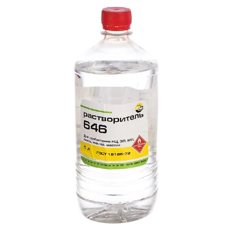 Растворитель 646 – это многокомпонентная, бесцветная или слегка желтоватая жидкость со специфическим запахом. В ее состав входят такие активные вещества как бутилацетат, этилцеллозольв, ацетон, этиловый спирт, толуол. Поставляется в таре объемом 1 л.
