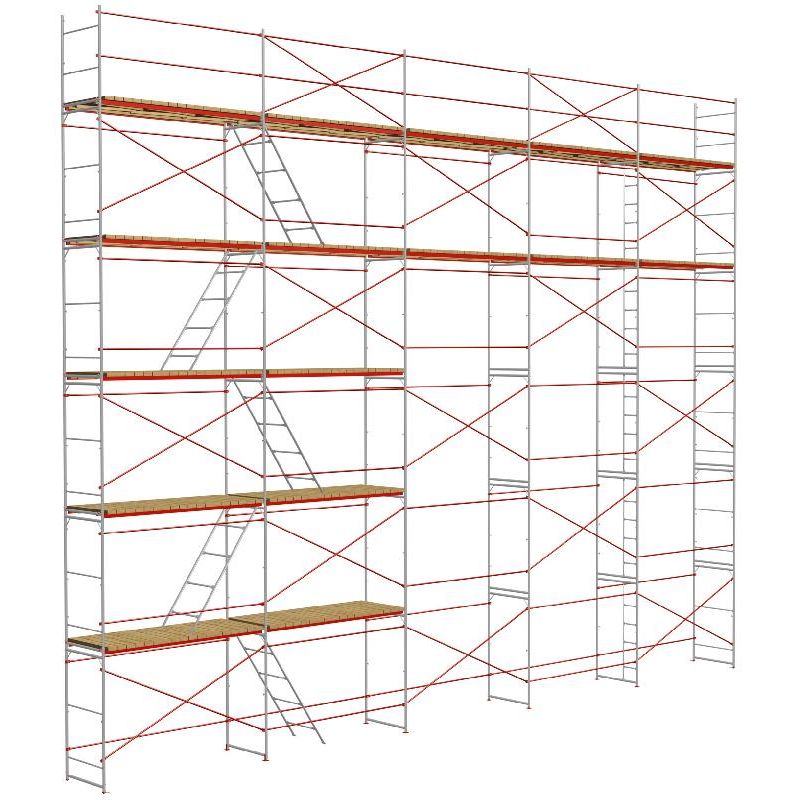 Леса рамные строительные приставные — это металлическая конструкция, которая состоит из различных элементов: рам, лестниц, диагональных и горизонтальных укрепляющих перекладин, ригелей, деревянных настилов, опор, элементов стеновых креплений.