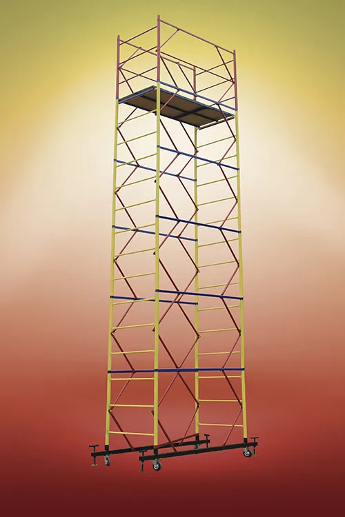 Основа конструкции выполнена из полых стальных труб повышенной прочности. Базовый блок представляет собой две опоры закрепленные перекладиной. На колесах установлены тормозные механизмы. Конструкция из рамы и лестниц весом в 150 кг выдерживает нагрузку 250 кг.