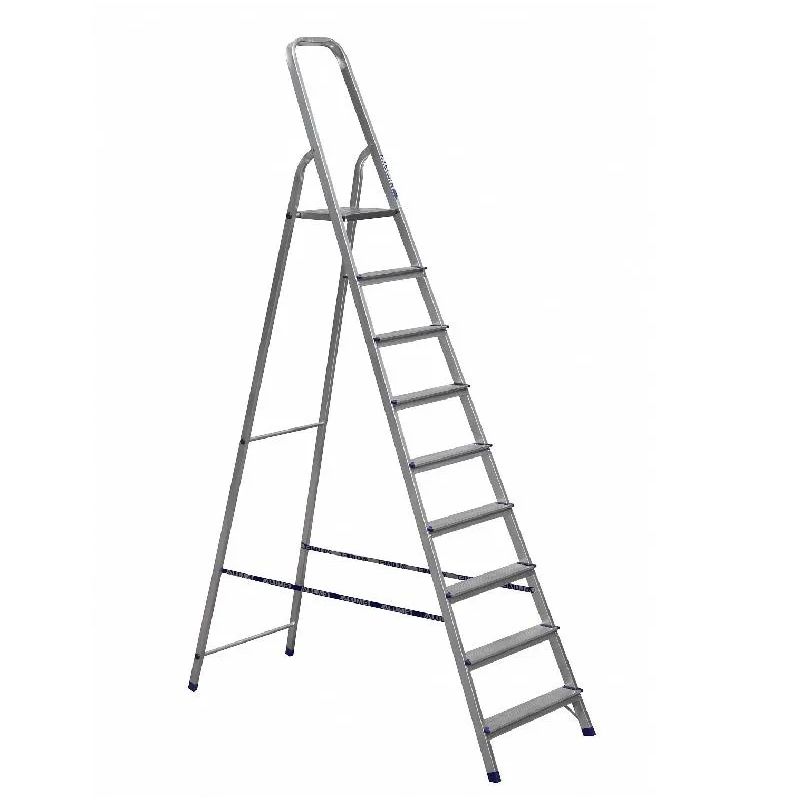 Стремянка алюминиевая изготовлена из высокопрочного алюминиевого профиля. Задняя и передняя нога соединены между собой. Рабочая площадка выполнена из оцинкованной стали. Ступени имеют рифленую поверхность. Башмаки изготовлены из высокопрочного пластика. Стремянка в рабочем положении надежно фиксируется рабочей площадкой, а начиная с пятиступенчатой и выше страховочными ремнями. Количество ступеней от 3-х до 10-и. Стремянка алюминиевая серии АМ предназначена для проведения различных видов работ на высоте до 4 м как в быту, так и на производстве.