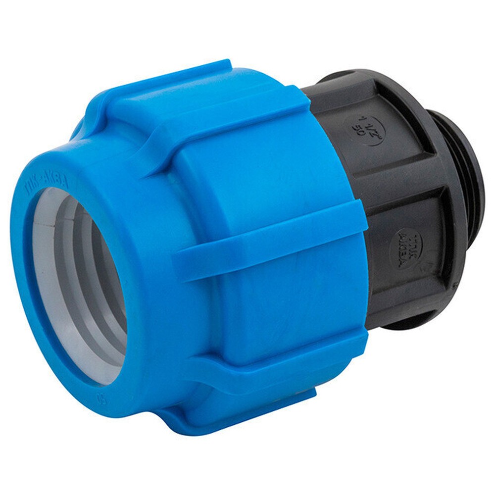 Муфта компрессионная с наружной трубной резьбой предназначена для соединения стального трубопровода с трубопроводом ПНД-труб. Муфта компрессионная имеет резьбу, соответствующую размерам и стандартам резьбы стальных труб. Такая муфта так же может использоваться в строительстве различных комбинаций отводов и разветвлений с применением других компрессионных ПНД-фитингов.