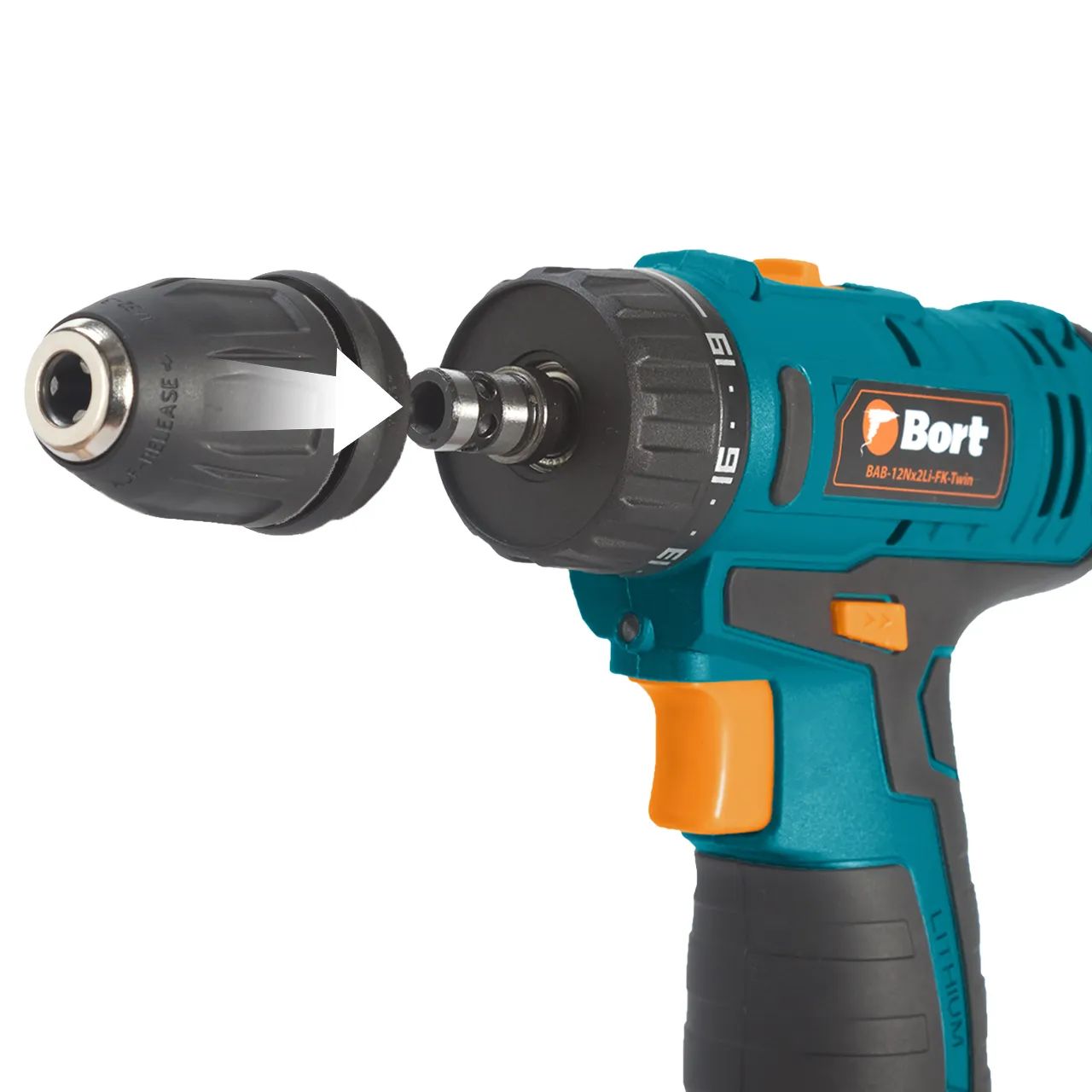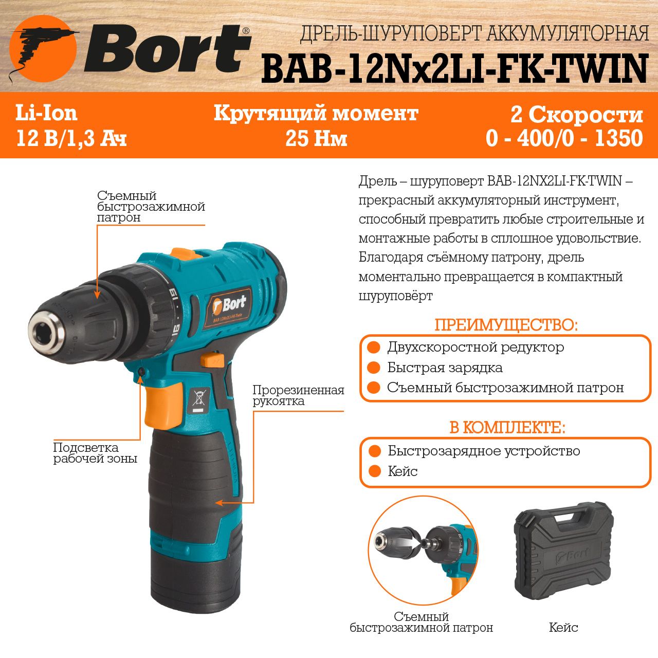 Дрель-шуруповерт Bort BAB-12Nx2Li-FK-Twin – легкая и мощная модель для домашнего использования. За счет Li-lon батареи обеспечивается бесперебойная и продолжительная работа. Малый вес – 1кг, компактный размер и яркая подсветка рабочей зоны позволяют использовать дрель в труднодоступных и затемненных местах. Мотор 550-й серии с двухскоростным редуктором обеспечивает продолжительную эксплуатацию и расширяет возможности инструмента, увеличивая крутящий момент до 25Нм. Съемный быстрозажимной патрон способствует быстрой смене оснастки. Наличие регулятора оборотов дает возможность выбрать нужную скорость вращения для определенного вида материалов. Оснащен моментальной остановкой и Li-Ion батарей, которая обеспечивает сохранность заряда длительное время. В комплекте идет быстрозарядное устройство и удобный кейс для хранения и комфортного перемещения инструмента.