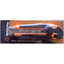 Нож с выдвижным лезвием 18 мм, двухкомпонентный корпус, металлическая направляющая, винтовой фиксатор, Вихрь предназначен для резки различных материалов в бытовых, хозяйственных или строительных целях. Нож имеет выдвижные , сегментированные, сменные лезвия, которые можно отламывать по мере износа режущей части. Нож Вихрь имеет двухкомпонентный корпус и винтовой фиксатор лезвия и оснащен металлической направляющей лезвия, что повышает прочность ножа при давлении на него во время резки.