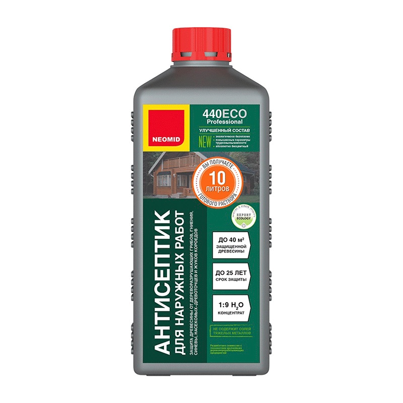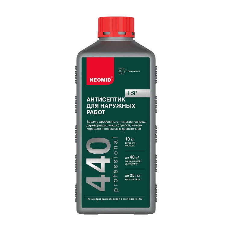 Предназначен для защиты древесины снаружи помещений, в том числе для работ в помещениях с высокой влажностью. Применяется для защиты древесины различных пород от гниения, поражения дереворазрушающими и деревоокрашивающими плесневыми грибами, насекомыми-древоточцами, водорослями, мхами, лишайниками. Концентрат, для изготовления рабочего раствора разбавить водой 1:9.