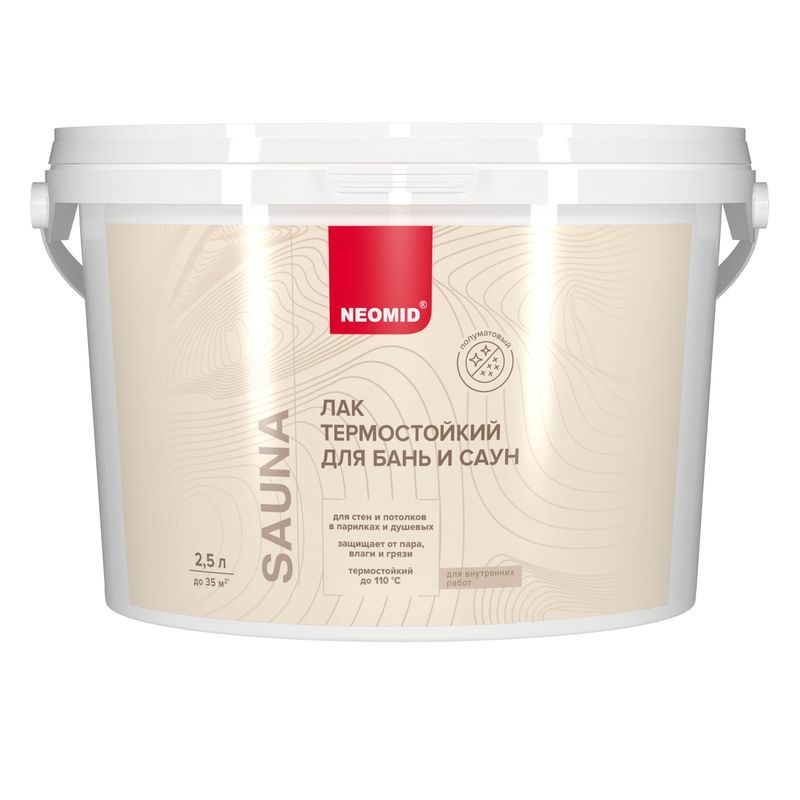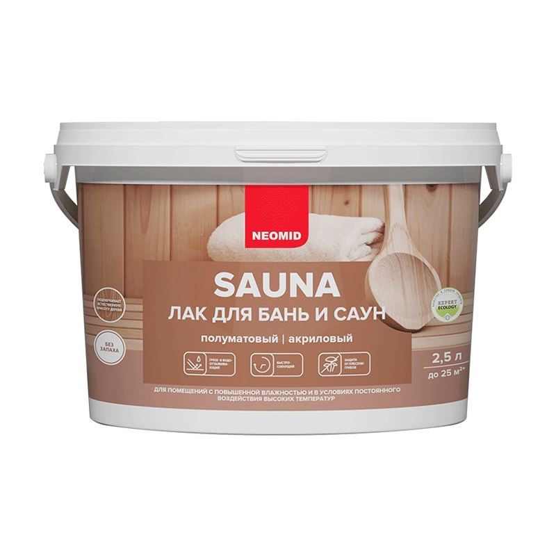 Лак для бань и саун Неомид Сауна предназначен для защиты и финишной декоративной отделки древесины в банях и саунах. Обеспечивает защиту древесины от потемнения и грибковых поражений за счет противогрибковых добавок.