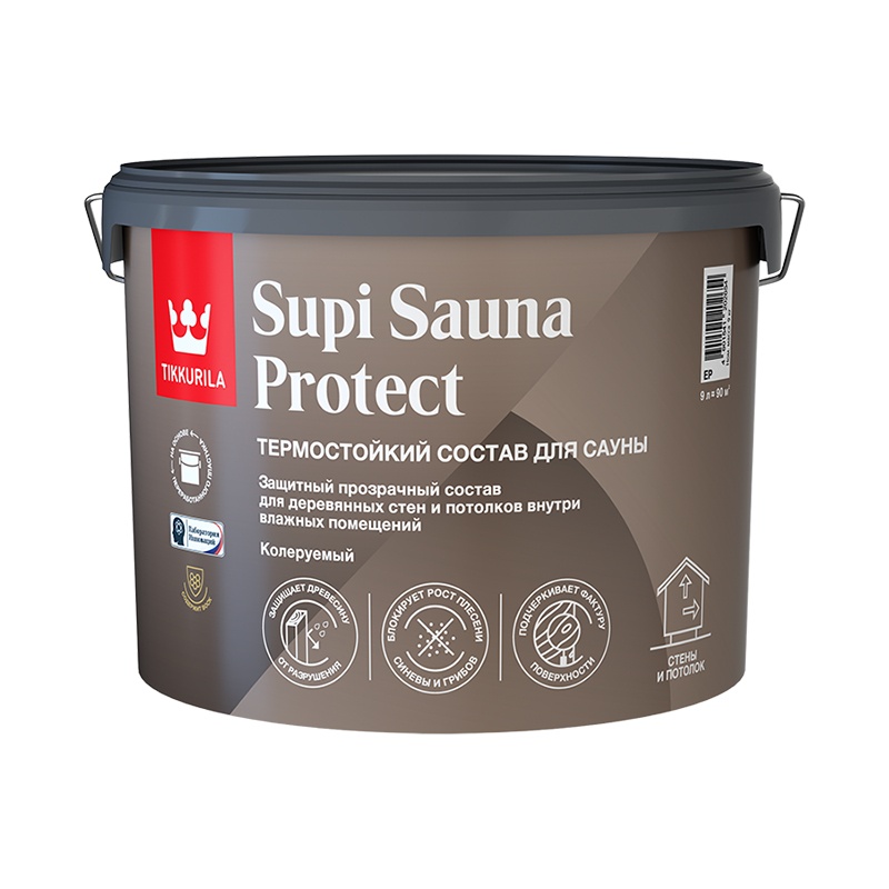 Колеруемый акрилатный защитный состав. Предназначен для поверхностей во влажных помещениях, образует грязе- и водоотталкивающую поверхность. Содержит защищающий обработанную поверхность противоплесневый компонент. Применяется для покрытия деревянных, древесноволокнистых и бетонных поверхностей, согласно инструкции по применению. Не применять для обработки полков бани. Применяется для обработки стен и потолков в парильне, душевой и раздевалке бани. Расход: 8-12 м²/л. Время высыхания: от пыли — 30 минут, следующий слой можно наносить через 2-3 часа. Поверхность готова к эксплуатации примерно через двое суток.